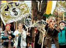 MELBOURNE September 11, 2000, 11 AM. Exclusive coverage. On the scene for PRODOS.COM: MP "Shutdown the World Economic Forum" That is the express goal of The s11, a network of organizations and demonstrators who are protesting outside Melbourne's Crown Casino complex and the Melbourne Exhibition buildings. Business leaders, including Bill Gates, along with political leaders have gathered in Melbourne for three days to discuss international trade. S11 is not planning just to object to their meeting. It plans to prevent it from taking place. The demonstrators have formed human chains around the entrances to Crown and are preventing anyone from entering the building. Mario tried to enter the building earlier and was grabbed by several protestors, and pushed back forcefully. When he said he had to enter to go to work he was told no-one is coming in today, "Take the day off, you don't have to go to work today." PRODOS: Do you consider physically blocking people from entering the building peaceful or violent? Britney: (A 15 year old high school student) We want a peaceful demonstration but if it takes violence then . . . We also speak to Amy, one of the s11 organisers, Ben, at the Union First Aid center, and Scott who is on the human chain at the Crown entrances At about 11 AM there were a couple of hundred demonstrators gathered. As the report progresses, the numbers rise rapidly to around four thousand. Protestors have been trying to push down barricades, they've climbed onto the roof of one building and are jumping up and down, a large number of protestors were banging on the windows at Crown, presumably to intimidate the occupants. S11.org Send PRODOS your feedback: prodos@prodos.com